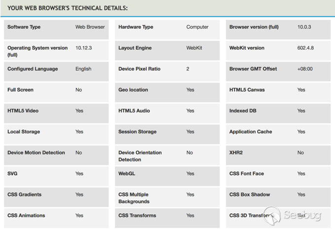 基本指纹是任何浏览器都具有的特征标识,比如硬件类型(Apple)、操作系统(Mac OS)、用户代理(User agent)、系统字体、语言、屏幕分辨率、浏览器插件 (Flash, Silverlight, Java, etc)、浏览器扩展、浏览器设置 (Do-Not-Track, etc)、时区差(Browser GMT Offset)等众多信息,这些指纹信息“类似”人类的身高、年龄等,有很大的冲突概率,只能作为辅助识别。可以在该网址进行查看本地浏览器的基本特征,https://www.whatismybrowser.com/