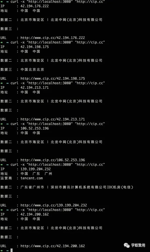 # http 代理 访问 http 站点curl -x "http://localhost:3080" "http://cip.cc"# http 代理 访问 https 站点curl -x "http://localhost:3080" "https://httpbin.org/post?a=b" -X POST -d "user=hahaha" -k# https 代理 访问 http 站点curl -x "https://localhost:3443" "http://cip.cc" --proxy-insecure# https 代理 访问 https 站点curl -x "https://localhost:3443" "https://httpbin.org/post?a=b" -X POST -d "user=hahaha" -k --proxy-insecure