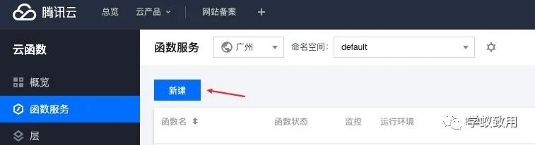 1. 打开 「函数服务」(https://console.cloud.tencent.com/scf/list?rid=1&ns=default) 点击「新建」