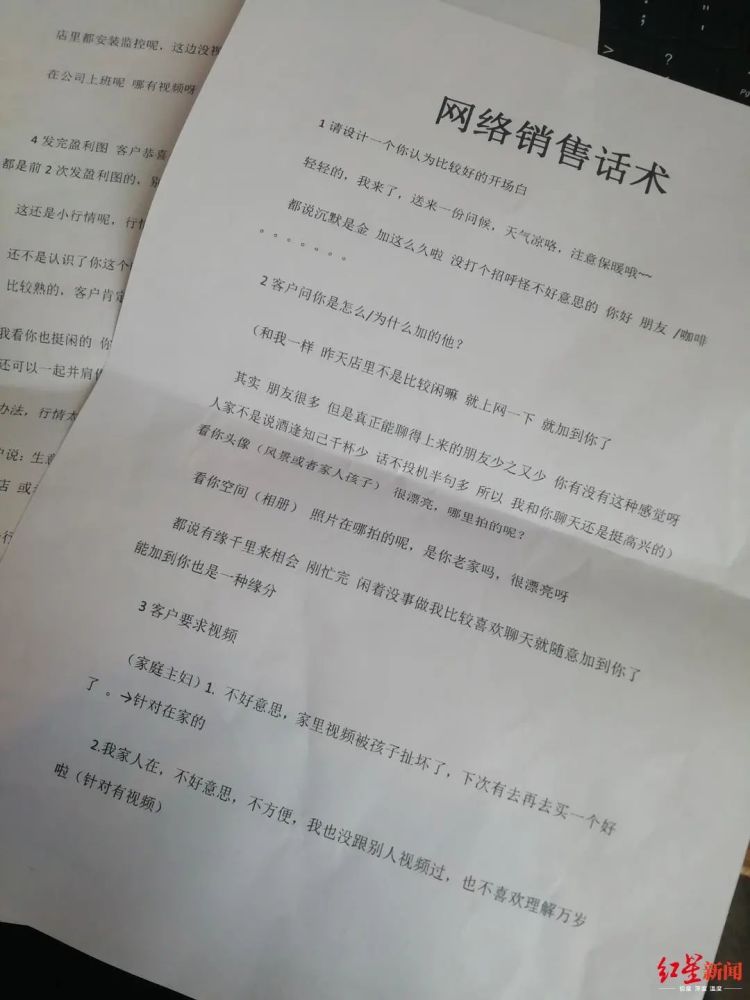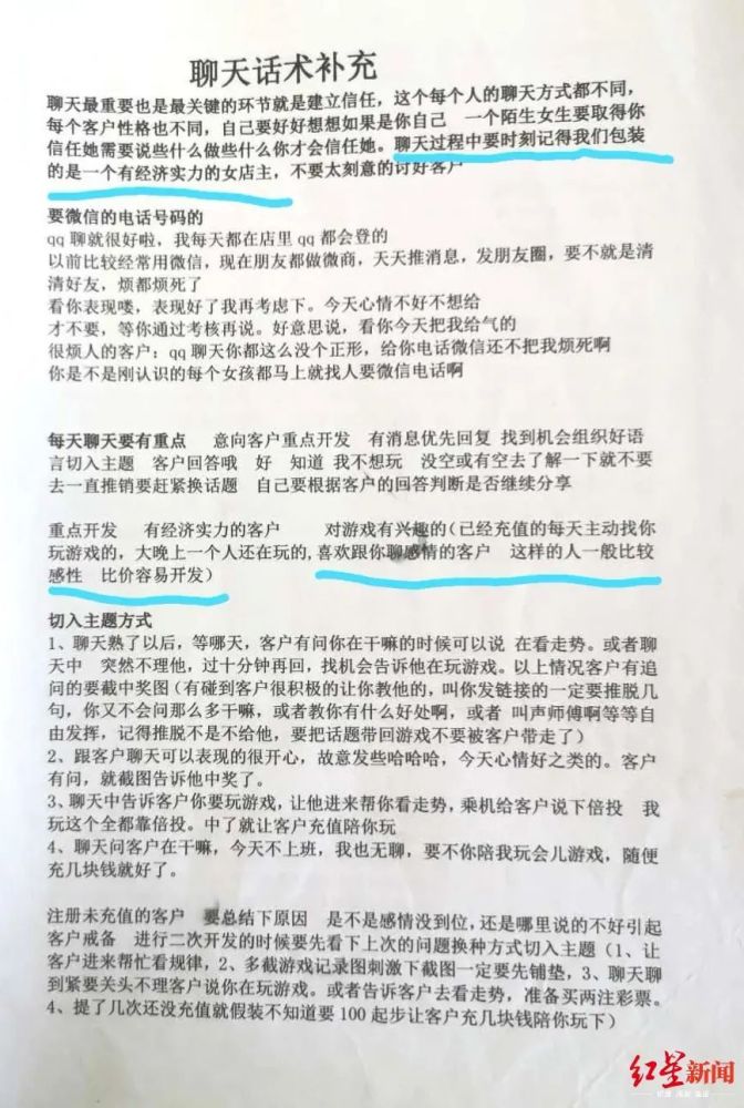在民警查获的赃物中,7本话术手册详细记录了余某、陈某等人如何一步步套路受害人,直至骗到钱财。红星新闻记者通过查看这几本话术手册发现:首先,嫌疑人会为自己设置一个有钱有闲的人物身份,男女均有,或为美容店女老板,或为建筑公司老板等等;其次,嫌疑人通过软件进行交友聊天,前期拉家常、谈感情,绝不涉及实质内容;再次,等了解到受害人的性格、职业、家庭情况和财务状况后,再慢慢引诱其上钩,继而实施诈骗。